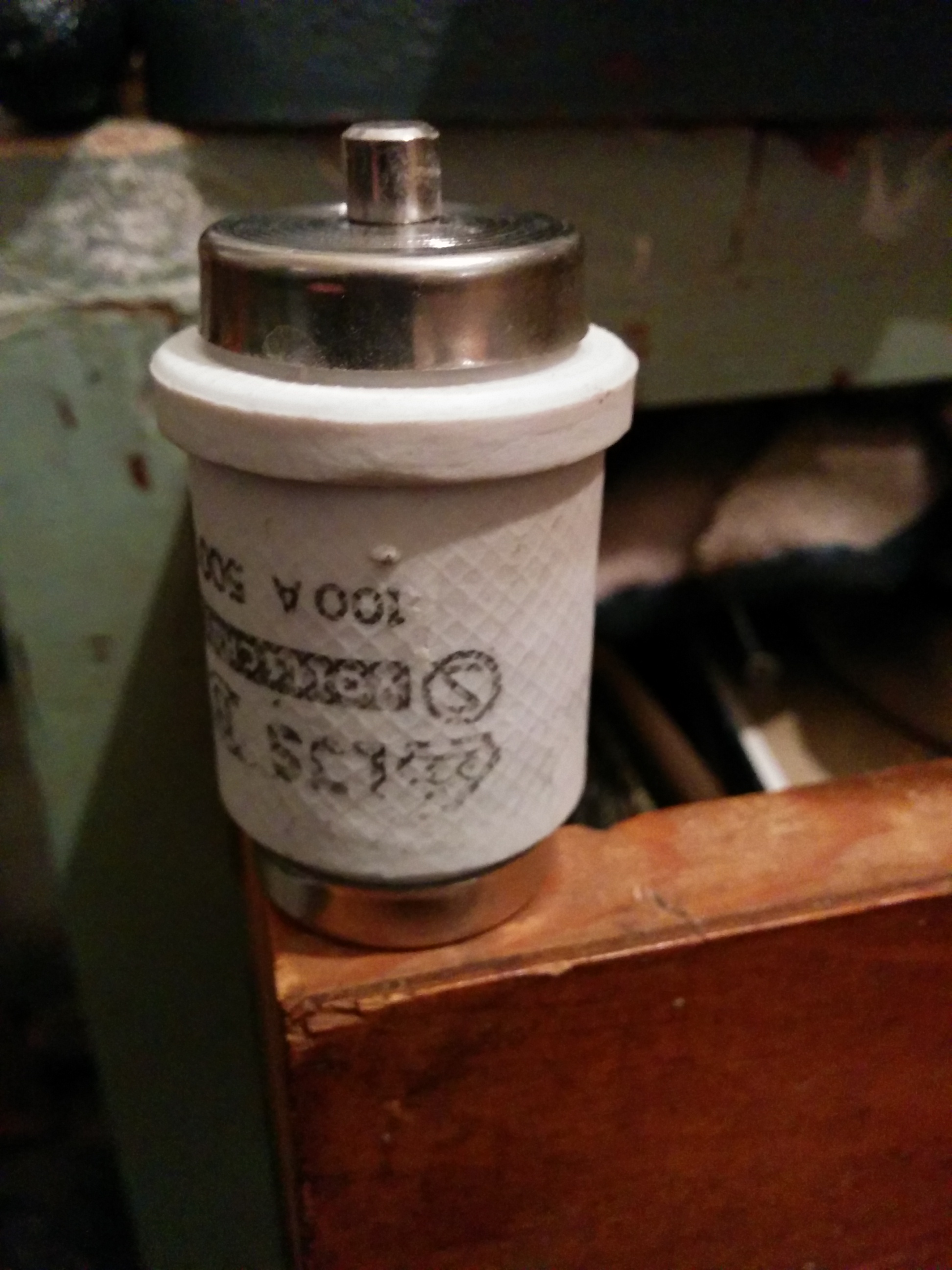 This fuse (actually 3 of them) are part of an electric installation powering a three-phase pottery furnace rated at about 60kW. Due to a faulty relay responsible for switching between Y and Δ configuration, two out of three phases where shorted to neutral. These fuses where rated at 100A each so when they blew, well, let's say there was light.